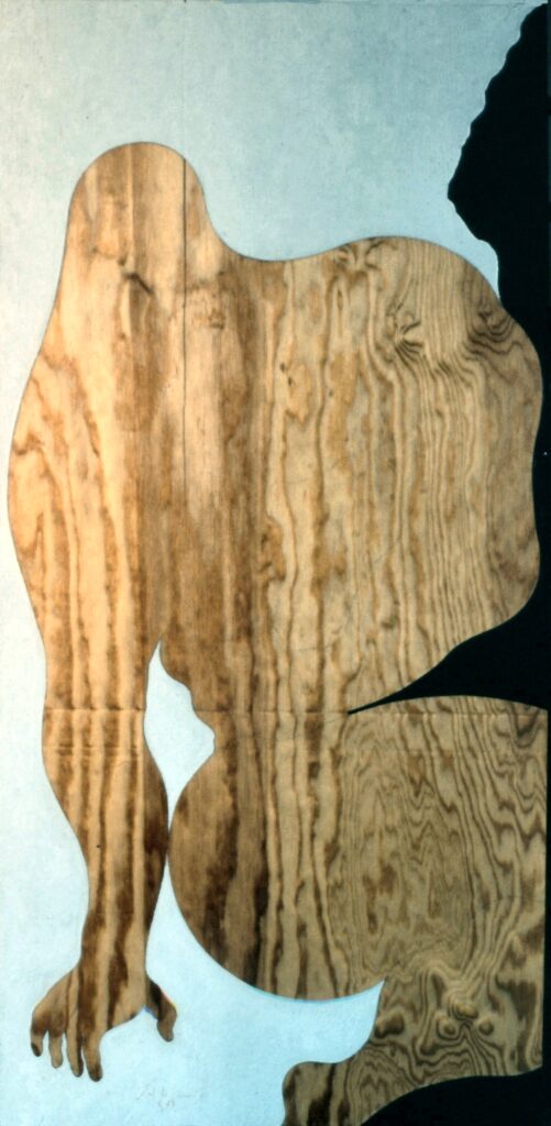 “….Il << legno >>, essenziale supporto in anni di ricerche, qui viene utilizzato in senso aspramente metaforico. Non solo la superficie dei quadri, colorata con tonalità tenui, ai limiti della trasparenza, è di compensato, ma pure le figure, intagliate in listelli di legno. Quale contrasto tra il calore che emana questa materia — persino il suo odore sa darci delle sensazioni di dolcezza e di pacata serenità — e ciò che raffigura! Presenze gonfie, ipertrofiche sebbene reali, di una selva umana senza palpiti: disarmonizzata. Automi. Che scorrono su nastri obbligati in una specie di epica della robotizzazione: affamati di codici e di numeri; e se talvolta si ribellano vanno a sbattere contro compatte muraglie color lavagna — la sequela di una cancrena di anni << senza moto né spinta >>? —, rimanendo imprigionati, paralizzati in uno spasimo che li sfonda, o li taglia in due tronconi in un’istantanea di vitalità assiderata.