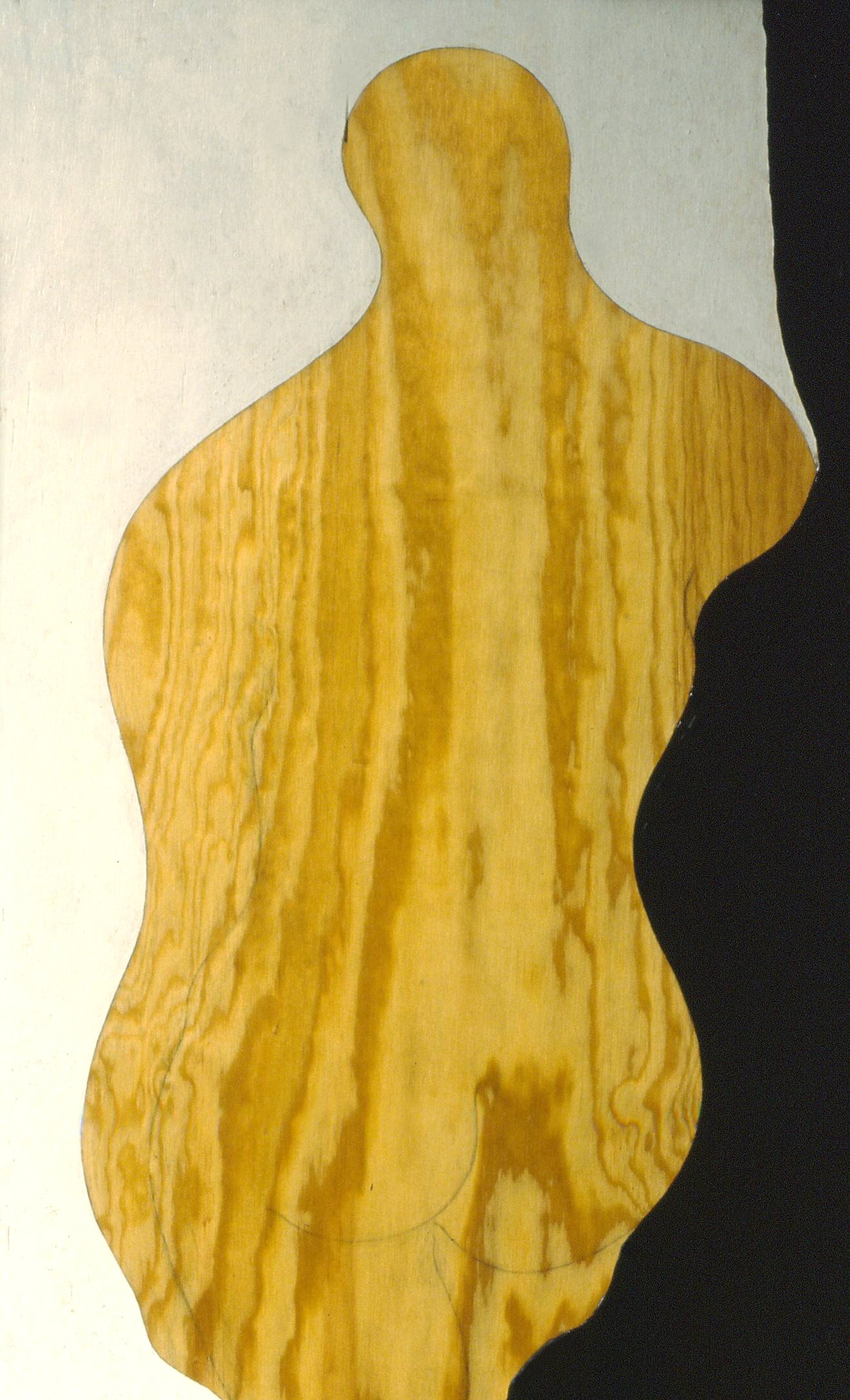 “….Il << legno >>, essenziale supporto in anni di ricerche, qui viene utilizzato in senso aspramente metaforico. Non solo la superficie dei quadri, colorata con tonalità tenui, ai limiti della trasparenza, è di compensato, ma pure le figure, intagliate in listelli di legno. Quale contrasto tra il calore che emana questa materia — persino il suo odore sa darci delle sensazioni di dolcezza e di pacata serenità — e ciò che raffigura! Presenze gonfie, ipertrofiche sebbene reali, di una selva umana senza palpiti: disarmonizzata. Automi. Che scorrono su nastri obbligati in una specie di epica della robotizzazione: affamati di codici e di numeri; e se talvolta si ribellano vanno a sbattere contro compatte muraglie color lavagna — la sequela di una cancrena di anni << senza moto né spinta >>? —, rimanendo imprigionati, paralizzati in uno spasimo che li sfonda, o li taglia in due tronconi in un’istantanea di vitalità assiderata.